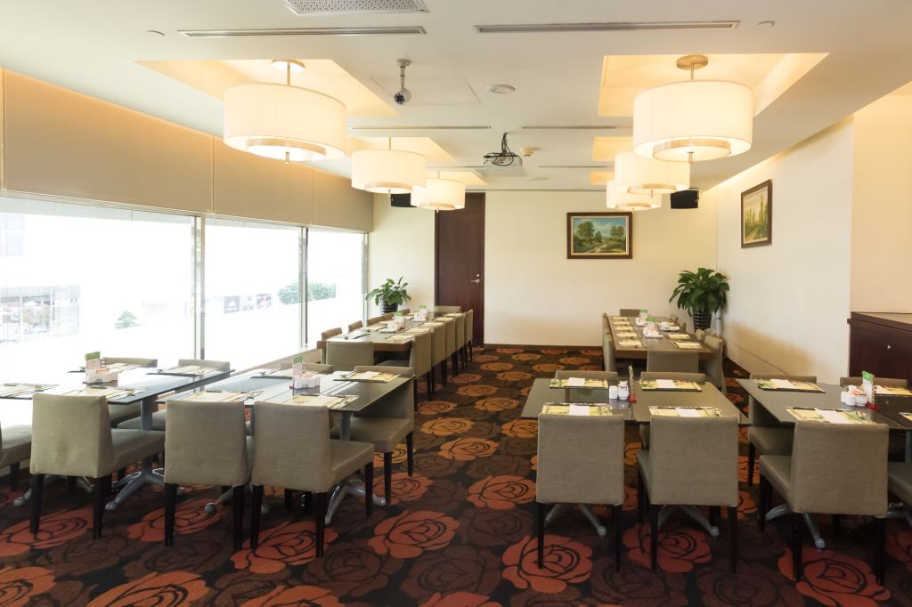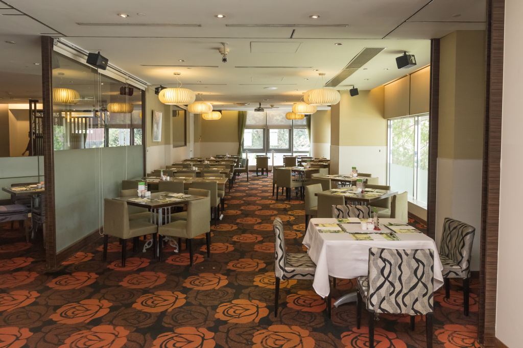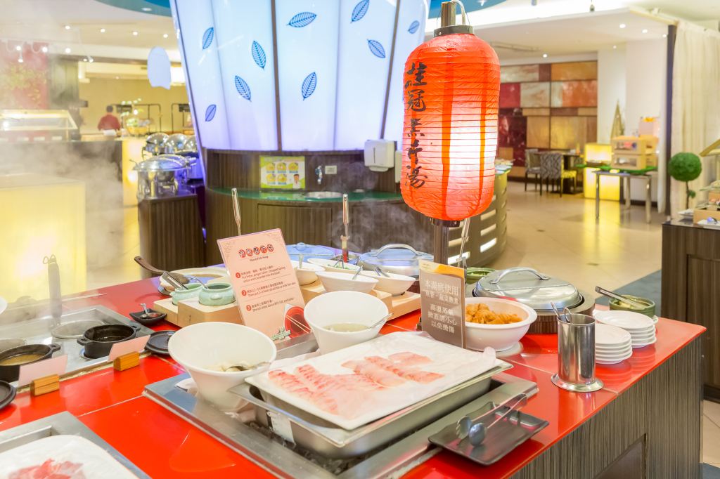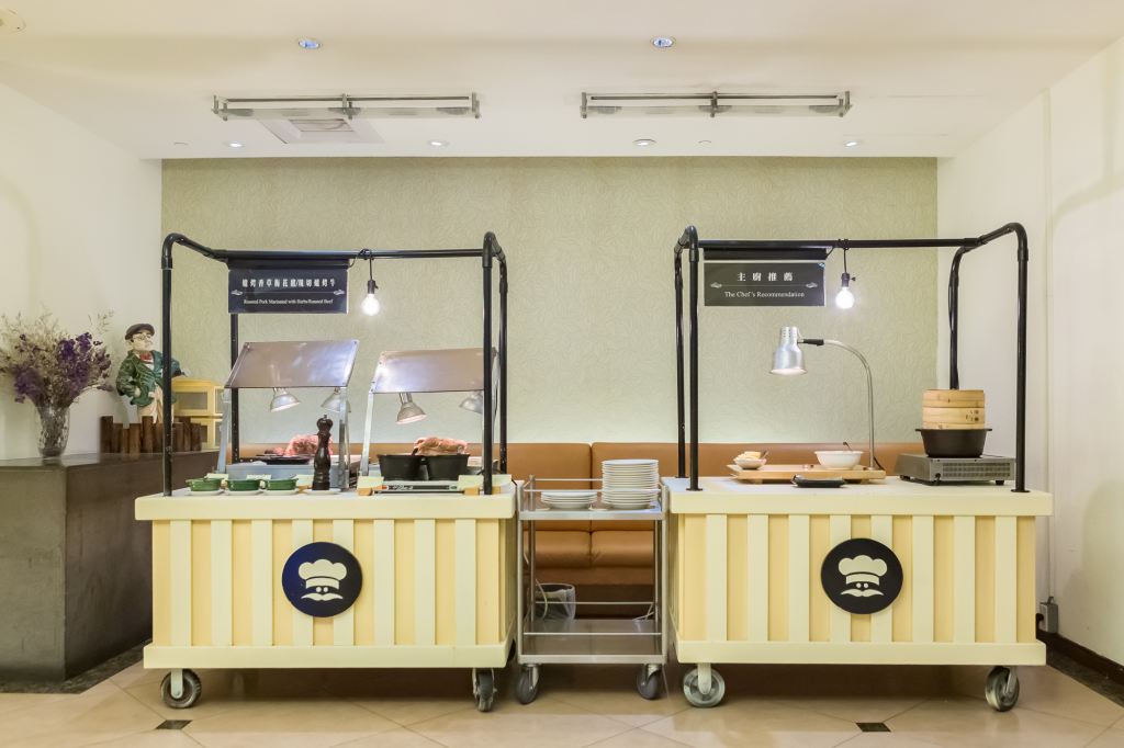 餐廳設計風格放鬆、自在、舒適,採用符合環保節能LED 燈泡的柔和照明,以紅色牆面點綴出熱鬧歡樂的氣氛,呼應鐵灰色的門片與間接撒落進來的陽光,取得視覺美感的平衡。225座位數中,可提供16-100人不等大小的落地靠窗獨立包廂,不論會議用餐與假日休閒聚會皆可靈活運用;中間取餐台的生命樹造型,代表酒店的公益、環保與永續經營理念